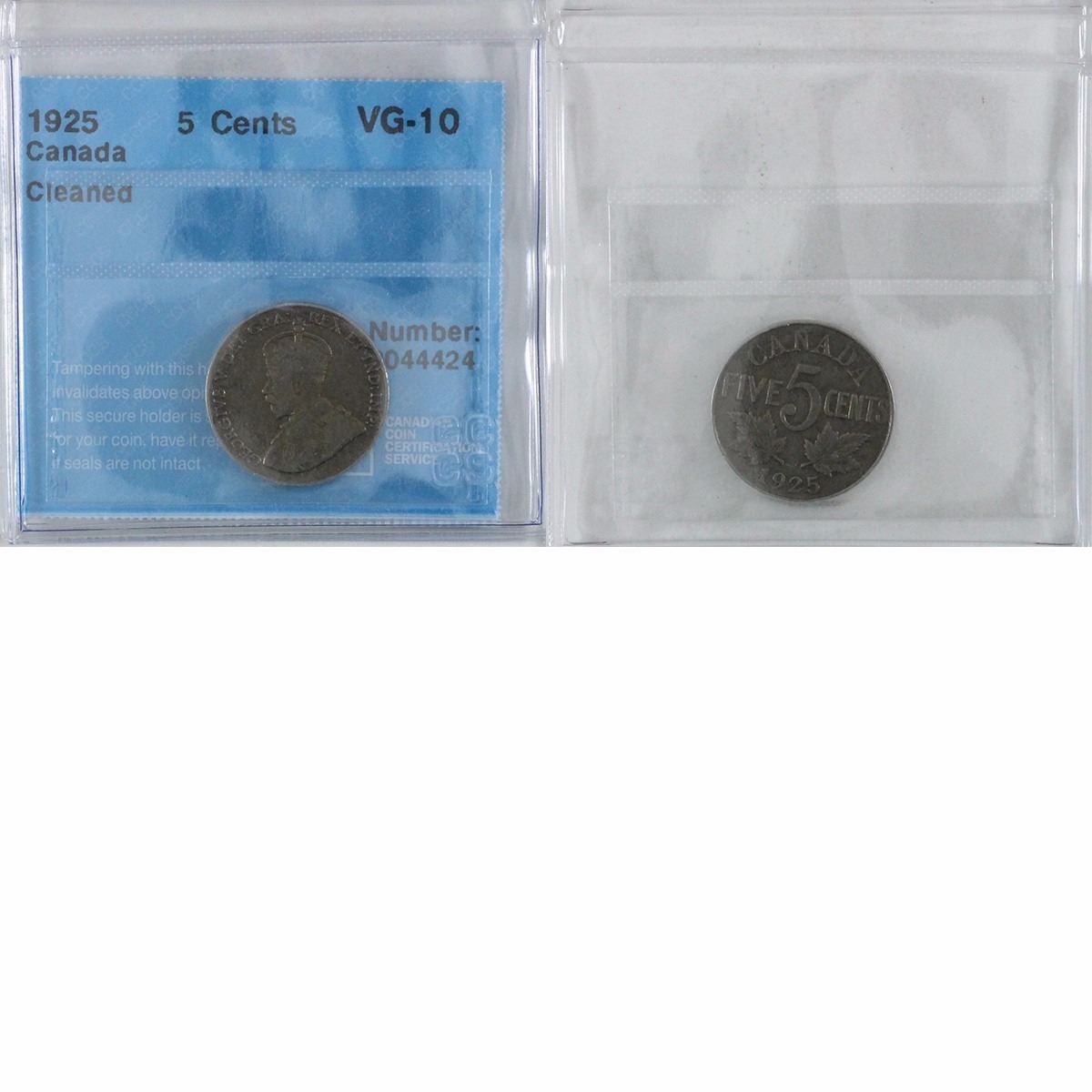 1925 Canada 5-cent CCCS Certified VG-10. Buyers Premium will be added on all items as per our terms of sale. We accept Paypal, Credit Card, E-Transfer Payments, Cheque or Money Orders (there is an additional 3% fee for using Paypal or Credit Card). All invoices will be emailed immediately following the auction, please contact us if you would like to pay by credit card or receive a new revised lower total for mailing in payment or sending an e-transfer (3% discount). All Items Are Sold "AS IS", no returns