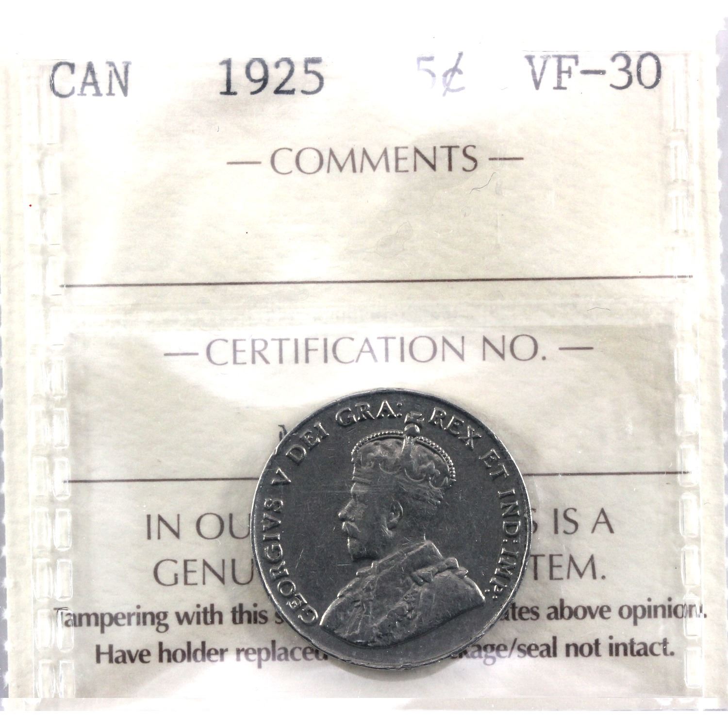 1925 Canada 5-cent ICCS Certified VF-30. A nice mid grade example of this key date issue.