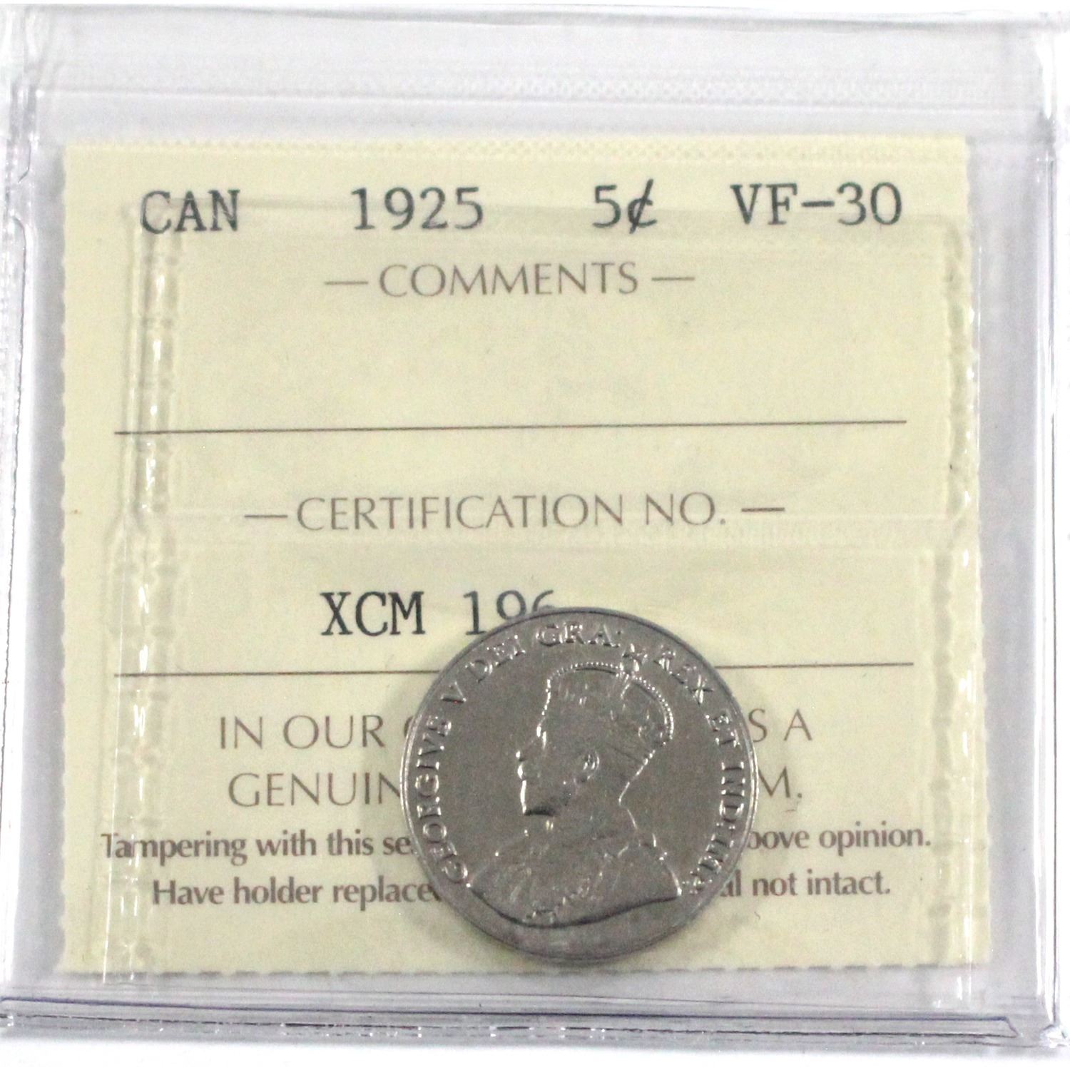1925 Canada 5-cent ICCS Certified VF-30.
