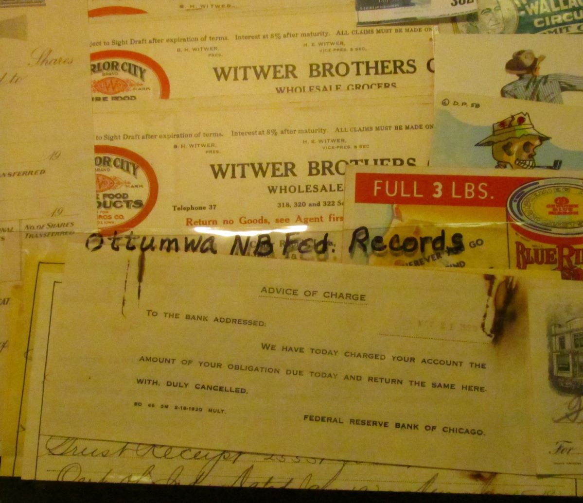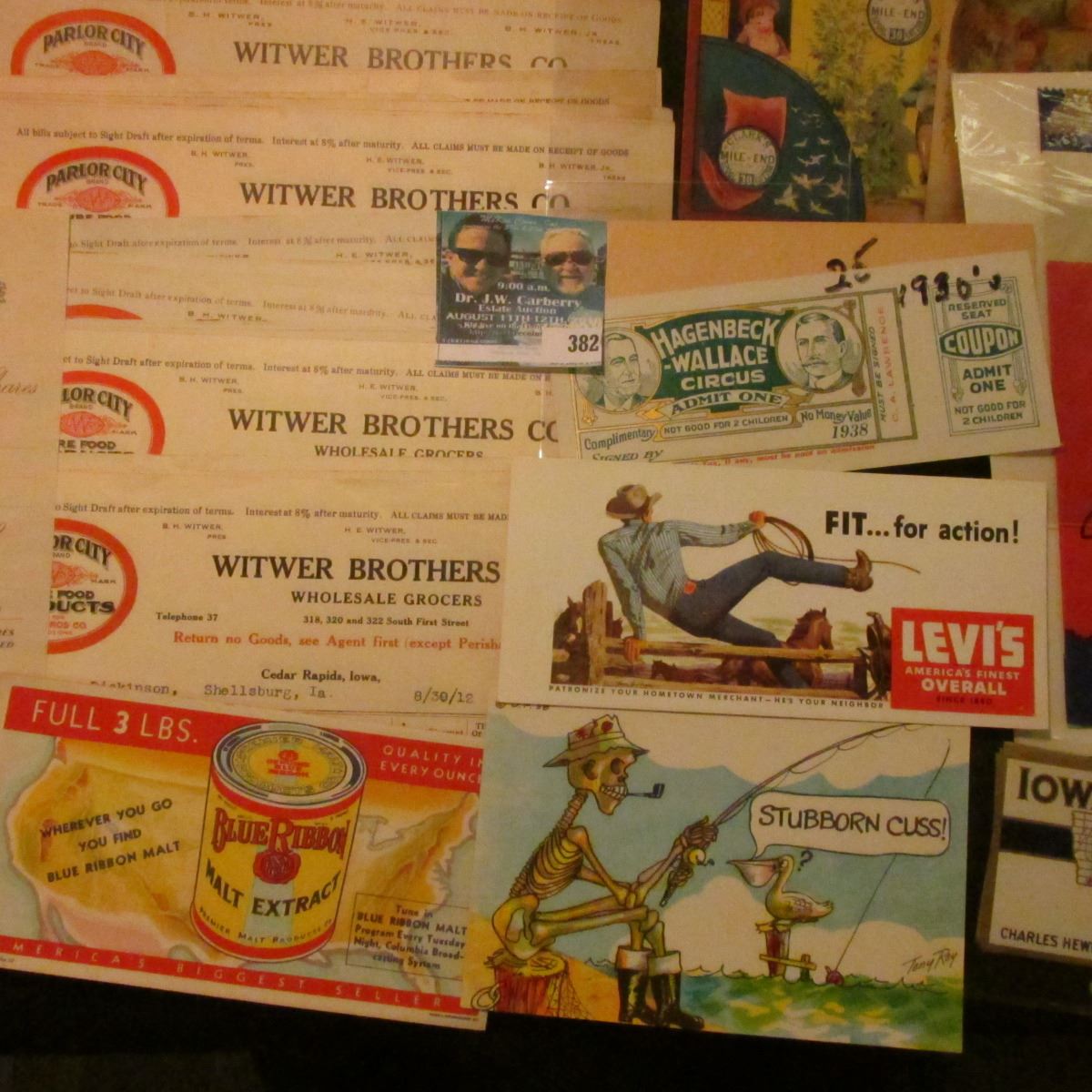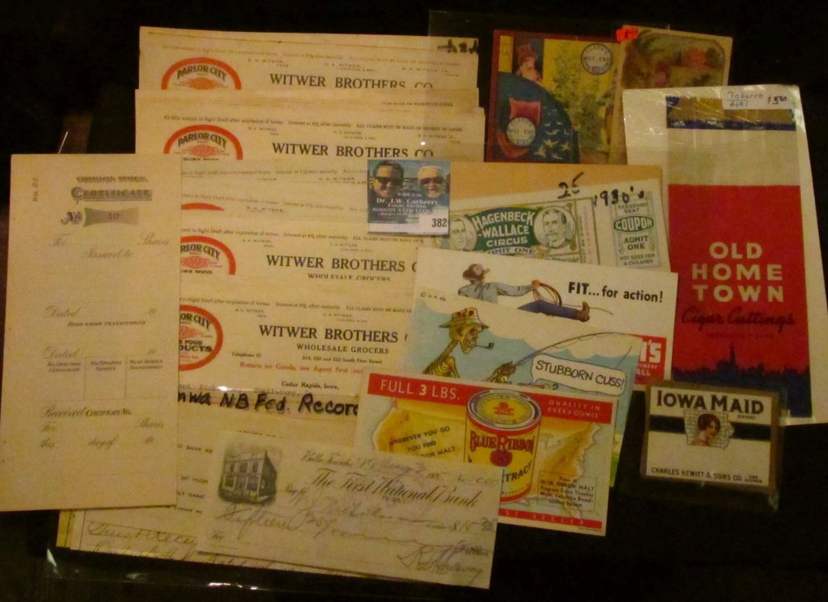 1925 Check depicting Bank Building "The First National Bank Belle Fourche, S.D." Rare check number "No. 0000"; several mint condition labels "Iowa Maid Brand"; ink blotter "Blue Ribbon Malt Extract"; post card "Stubborn Cuss! depicts a fisherman's skeleto