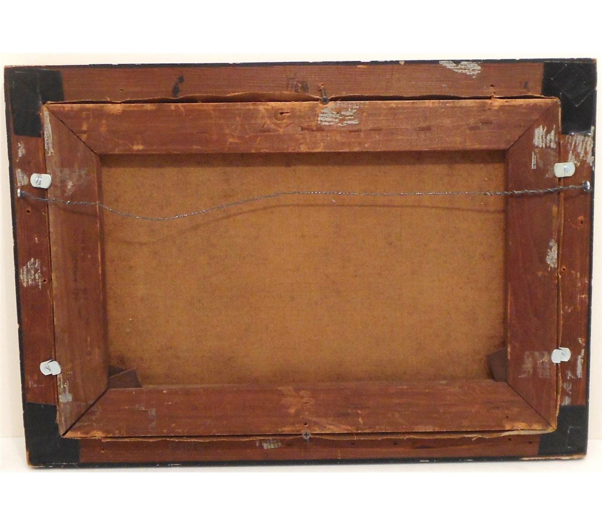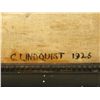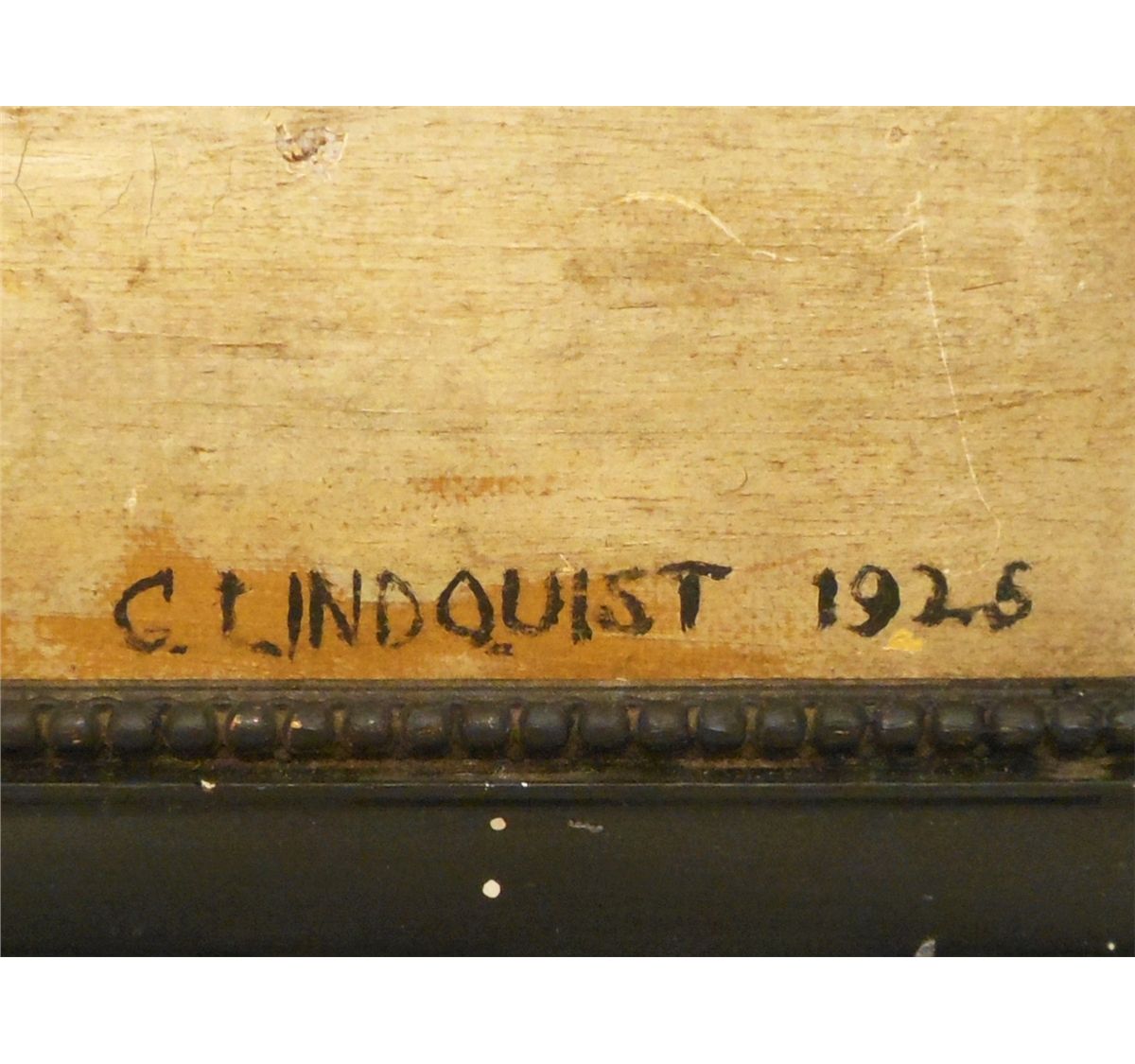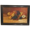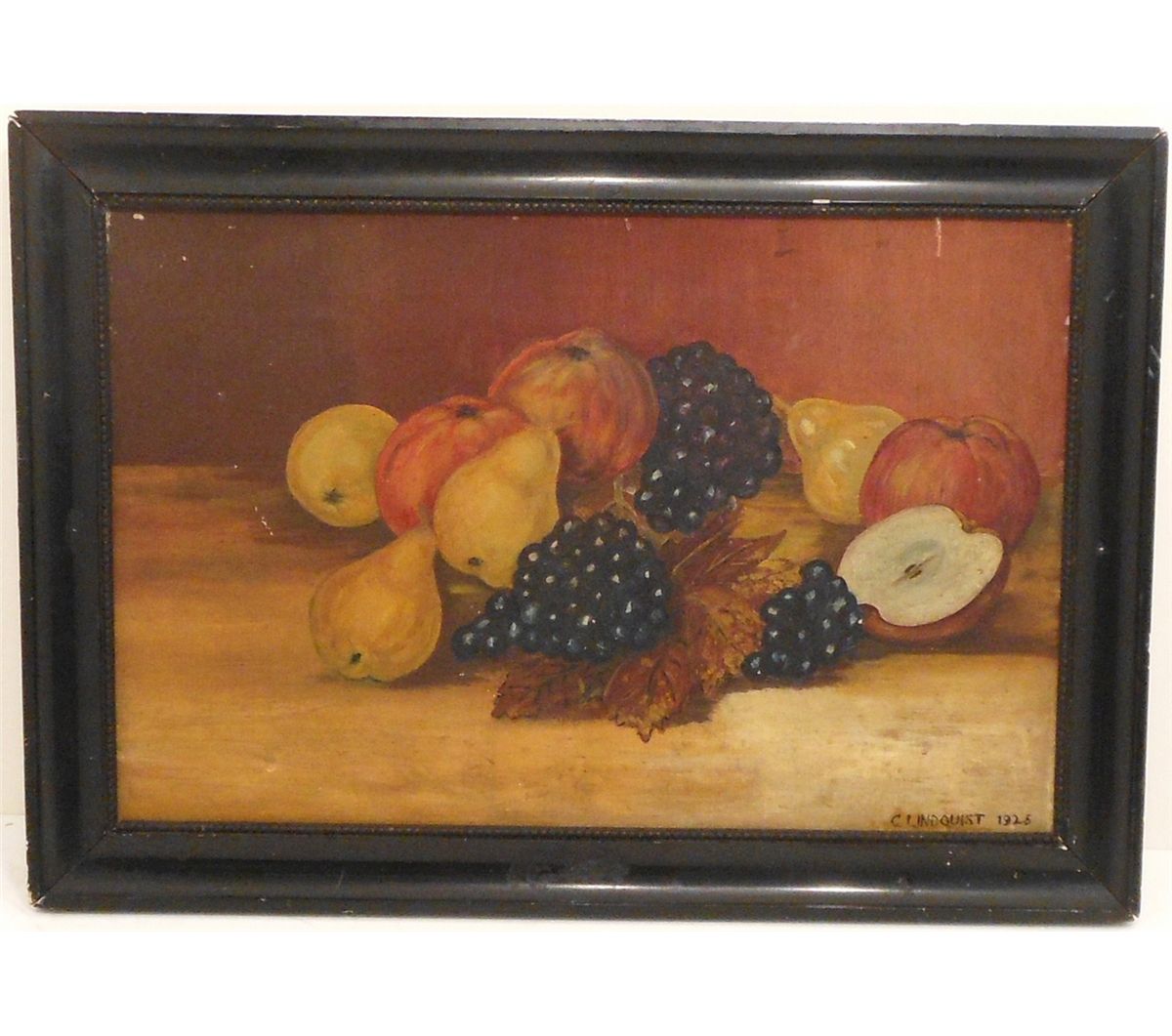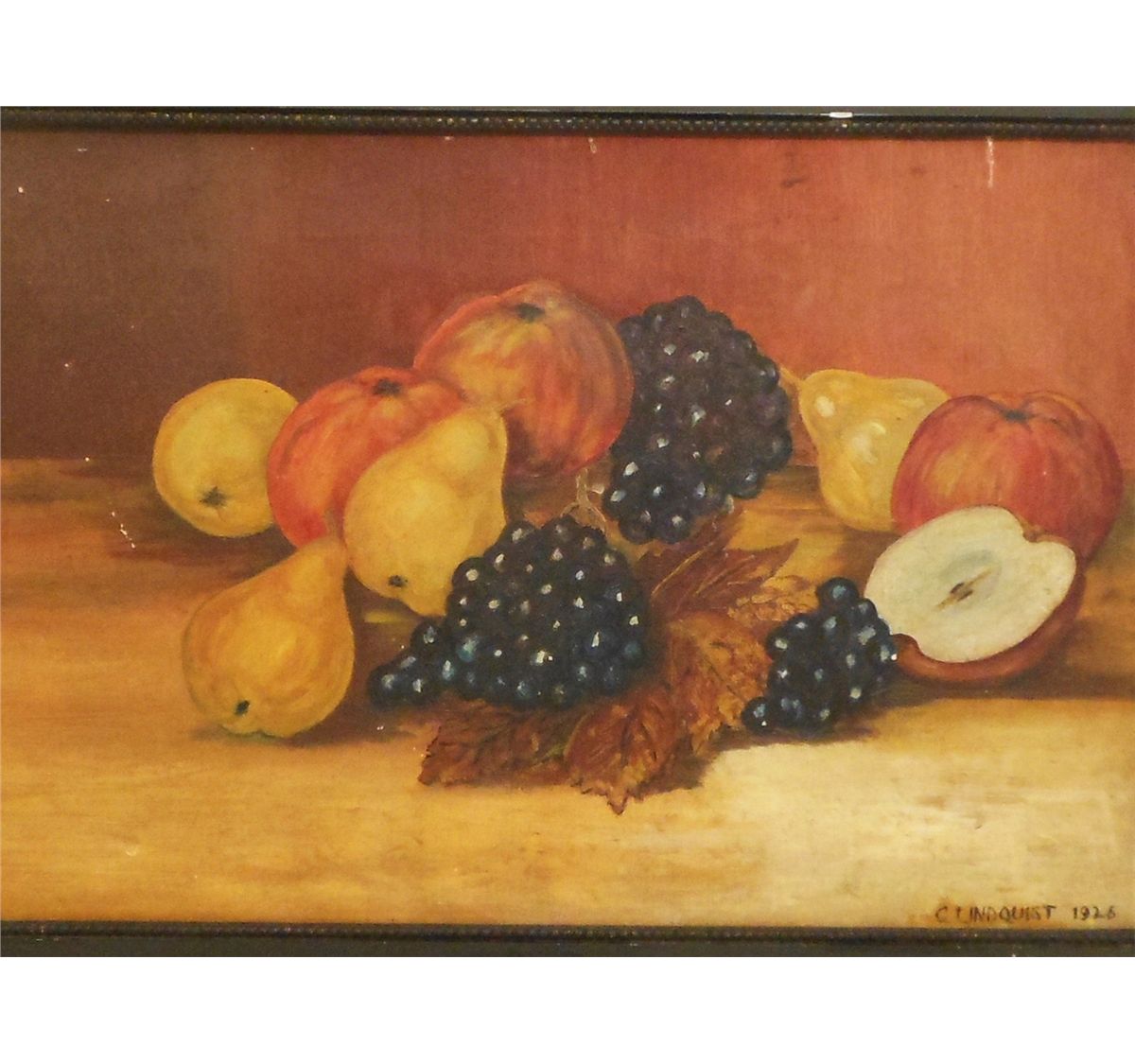 17 3/4" X 11 1/2" in a 21" X 14 3/4" Frame. Clara Lindquist Oil on Canvas Still Life of Fruit. Signed and Dated 1925 in lower right. Artist from Lawrence, Kansas. Good Condition with some small holes, cracklature, areas of pain loss, and some stains/discolorations. (See Pictures). Frame is in rough shape with many signs of wear and loose corners. (See Pictures)