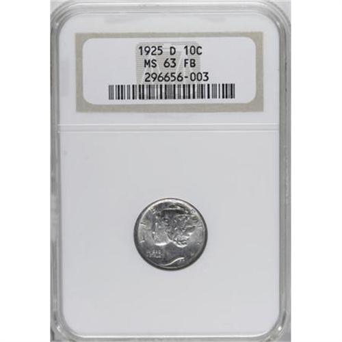 <B>1925-D 10C MS63 Full Bands NGC.</B></I> A crisply detailed and pleasingly toned Select example of this mid-date D-mint issue. Strongly lustrous with lightly abraded, minimally patinated centers and glints of violet and tan at the margins.<BR><BR><B>Coin Engraver:</B> Adolph A. Weinman<BR><BR><b>Shipping:</b> Coins & Currency (<a target="_blank" href="http://www.heritageauctions.com/common/shipping.php">view shipping information</a>)