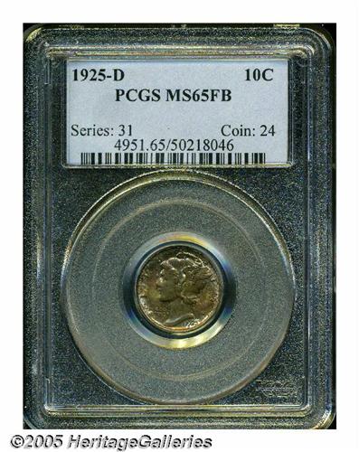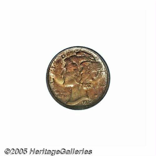 <B>1925-D<10C> MS65 Full Bands PCGS.</B></I> For the toning enthusiast, this example will be highly prized. The surfaces have frosty luster with iridescent toning, deeper on the obverse. It is a sharply struck example of the date, one of few Gem quality coins with full central bands on the reverse. Population: 24 in 65, 24 finer (5/05).