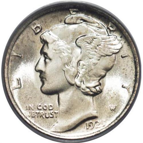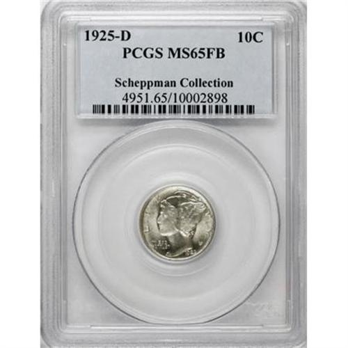 <B>1925-D 10C MS65 Full Bands PCGS.</B></I> Though whispers of silver-gray toning are present at the obverse margins, this sharply struck and shining Gem appears brilliant at first glance. Beautifully preserved for the grade assigned with amazing eye appeal for this notoriously ill-struck Denver issue. PCGS has graded 28 finer Full Bands coins (12/07).<BR><I>From The Scheppman Collection, #4 PCGS Registry of Full Band Mercury Dimes.</B></I><BR><BR><B>Coin Engraver:</B> Adolph A. Weinman<BR><BR><b>Shipping:</b> Coins & Currency (<a target="_blank" href="http://www.heritageauctions.com/common/shipping.php">view shipping information</a>)