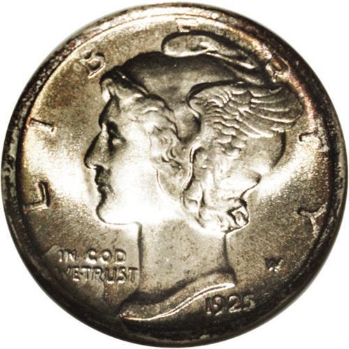 <B>1925-D<10C> MS66 Full Bands NGC.</B></I> A gorgeous Gem with satiny silver surfaces and fully brilliant luster, masked by faint gold and iridescent toning along the borders on each side. Sharp central devices but slightly weak along the peripheral details. Just five finer examples have been certified by PCGS and NGC. Census: 16 in 66, 3 finer (4/06).