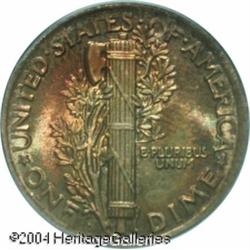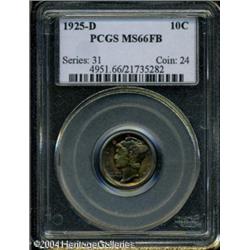 1925-D 10C MS66 Full Bands PCGS. A magnificently t <B>1925-D 10C MS66 Full Bands PCGS.</B></I> A magnificently toned Premium Gem example with deep shades of sunset-gold, crimson, and cobalt-blue intermingled over each side. The luster is as fresh as the day this coin left the Denver mint and there are only a couple of tiny abrasions noted on the reverse. Among the scarcer D-mint issues from the Roaring '20s, the 1925-D is also one of the most challenging dates in this series with respect to striking quality. We anticipate that this powerfully impressed Gem will see spirited bidding at auction. Population: 22 in 66, 2 finer (10/04). <BR><BR><B>Important notice:</B> Heritage usually auctions material at the rate of 200-250 lots per hour. On some occasions eBay Live bid software or the Internet may not be able to keep up with the pace of the auction. We recommend placing a realistic absentee bid now as insurance to avoid disappointment. Occasionally the auctioneer may eliminate or reject an eBay Live bid, and the auctioneer may also reopen a lot after the close of the eBay live bidding (usually because we missed an audience bid), and may reject your bid even if it shows you as the winning bidder. By bidding via eBay Live, you agree that Heritage may award the lot to another bidder at its sole discretion under the circumstances described above or any other reasonable circumstances. Since eBay bids are not shown to us until we open the lot on the floor, we treat those bids just like floor bids. In most cases the floor responds before the eBay bid is presented to us, due to Internet lag time, so for consistency we have made it a policy that floor bids are always considered first over tie eBay live bids. Also please note that all Heritage lots purchased through eBay Live carry a 20% Buyer's Premium. Please make sure you read the Terms and Conditions before you bid. This lot is being auctioned in conjunction with a live floor auction by Heritage Galleries & Auctioneers. All final auction and invoice information will be supplied by Heritage Galleries & Auctioneers, and all other information should be considered preliminary. Lot:5808