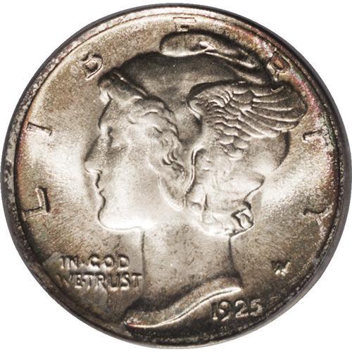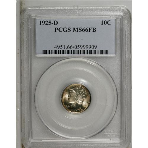 <B>1925-D 10C MS66 Full Bands PCGS.</B></I> Well struck with minor fadeaway on some of the peripheral features, with a bright finish and luscious variegated patina on both sides. Both sides of the piece have been carefully protected from harm, and distracting marks or even small blemishes seem virtually nonexistent. Population: 27 in 66 Full Bands, 2 finer (10/06).<BR><BR><b>Shipping:</b> Coin/Currency (<a target="_blank" href="http://www.heritageauctions.com/common/shipping.php">view shipping information</a>)