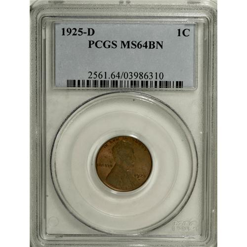 <B>1925-D 1C MS64 Brown PCGS.</B></I> PCGS Population (21/2). NGC Census: (22/8). Mintage: 22,580,000. Numismedia Wsl. Price for NGC/PCGS coin in MS64: $136. (#2561)<BR><BR><b>Shipping:</b> Coins & Currency (<a target="_blank" href="http://www.heritageauctions.com/common/shipping.php">view shipping information</a>)