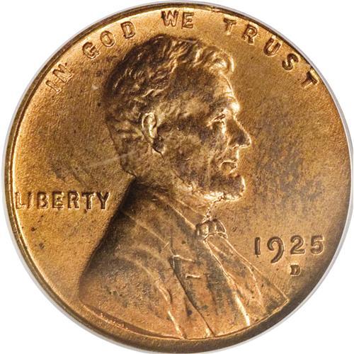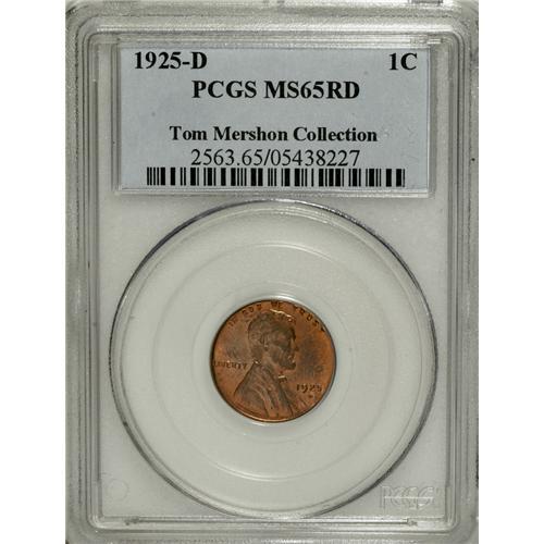 <B>1925-D 1C MS65 Red PCGS.</B></I> Ex: Tom Mershon Collection. Reddish-orange patina with some muting on each side and remnants of a fingerprint on the obverse. The strike is nice, and well above-average for this issue, which is noted as one of the most poorly produced of all Lincoln cents. Some counterclockwise die rotation is seen on the reverse. Population: 38 in 65 Red, 1 finer (4/07).<BR><I>Ex: 2005 St. Louis CSNS Signature Auction (5/2005), lot 5348, which realized $3,737.50.</B></I><BR><BR><b>Shipping:</b> Coins & Currency (<a target="_blank" href="http://www.heritageauctions.com/common/shipping.php">view shipping information</a>)
