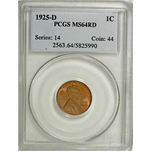 <B>1925-D 1C MS64 Red PCGS.</B></I> PCGS Population (230/39). NGC Census: (74/7). Mintage: 22,580,000. Numismedia Wsl. Price for NGC/PCGS coin in MS64: $336. (#2563)<BR><BR><B>Coin Engraver:</B> Victor D. Brenner<BR><BR><b>Shipping:</b> Coins & Currency (<a target="_blank" href="http://www.heritageauctions.com/common/shipping.php">view shipping information</a>)