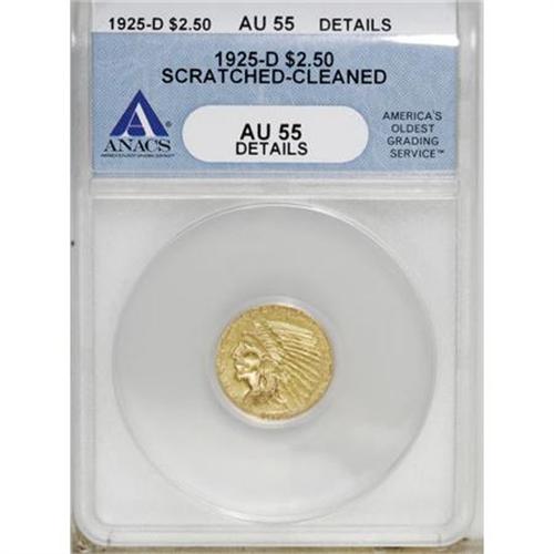 <B>1925-D $2 1/2 --Cleaned, Scratched--ANACS. AU55 Details.</B></I> NGC Census: (62/13951). PCGS Population (327/9829). Mintage: 578,000. Numismedia Wsl. Price for NGC/PCGS coin in AU55: $224. (#7949)<BR><BR><B>Coin Engraver:</B> Bela Lyon Pratt<BR><BR><b>Shipping:</b> Coins & Currency (<a target="_blank" href="http://www.heritageauctions.com/common/shipping.php">view shipping information</a>)