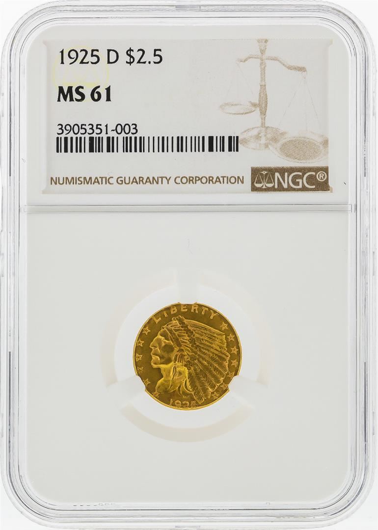 One 1925-D $2 1/2 Indian Head Quarter Eagle Gold Coin NGC MS61. NGC Certified.