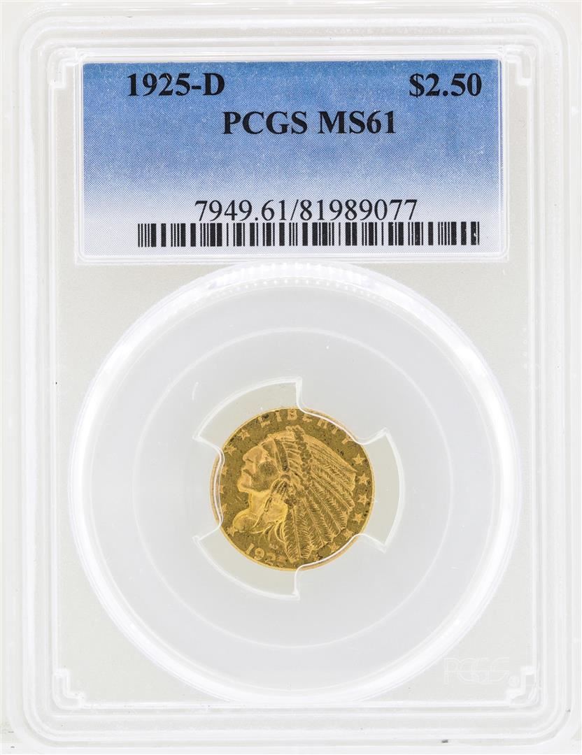 One 1925-D $2 1/2 Indian Head Quarter Eagle Gold Coin NGC MS61. NGC Certified.
