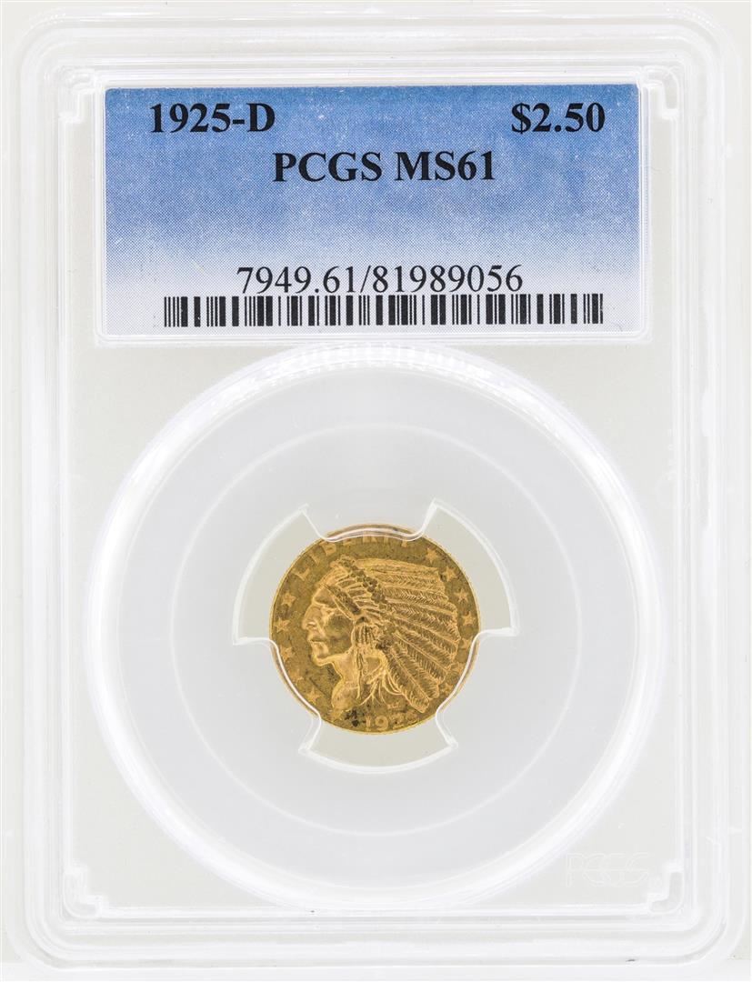One 1925-D $2 1/2 Indian Head Quarter Eagle Gold Coin NGC MS61. NGC Certified.