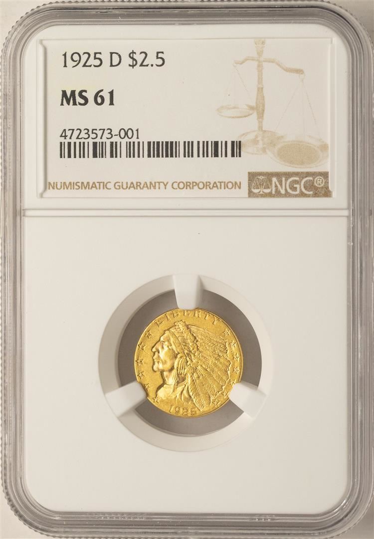 One 1925-D $2 1/2 Indian Head Quarter Eagle Gold Coin NGC MS61. NGC Certified.