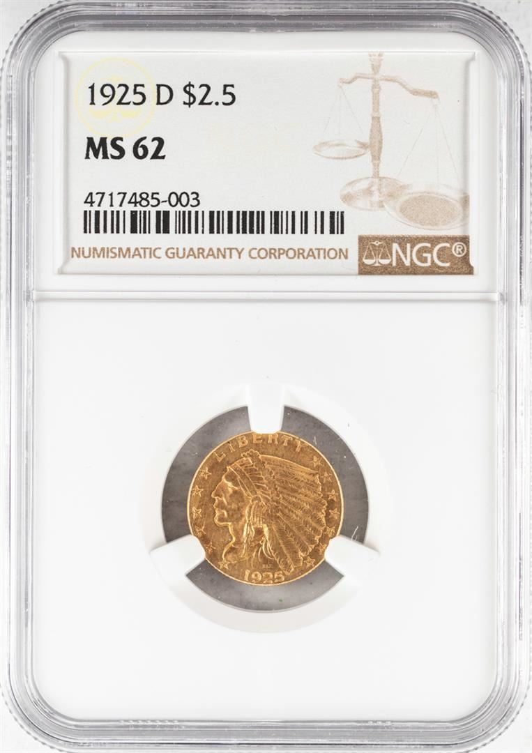 One 1925-D $2 1/2 Indian Head Quarter Eagle Gold Coin NGC MS62. NGC Certified.