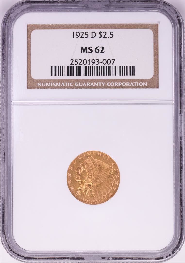 One 1925-D $2 1/2 Indian Head Quarter Eagle Gold Coin NGC MS62. NGC Certified.