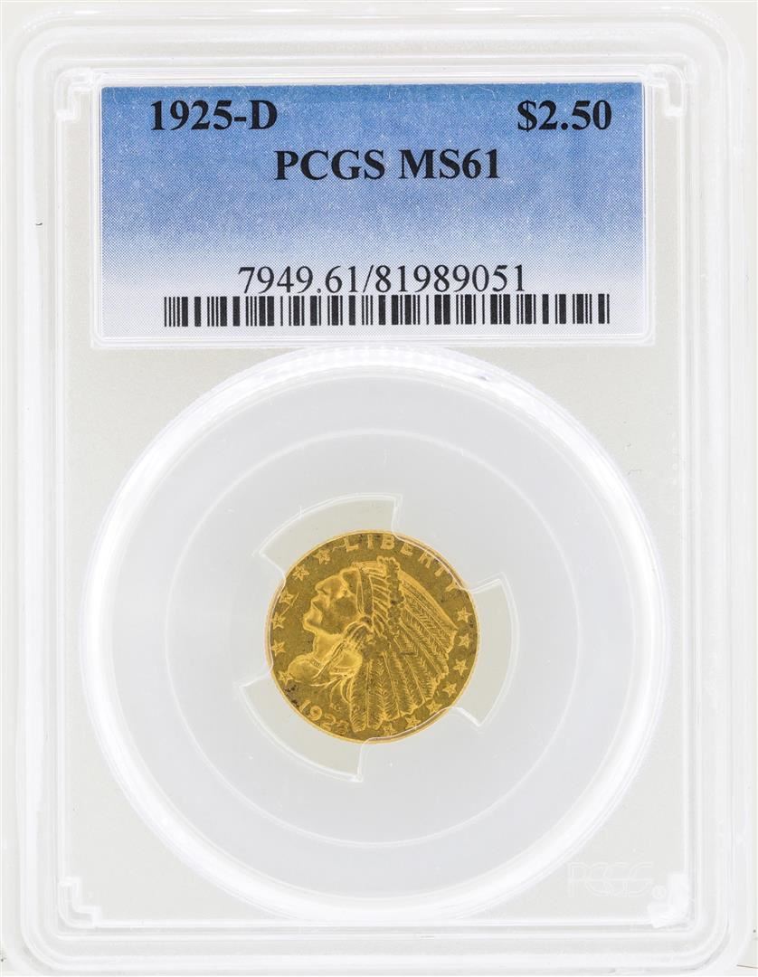One 1925-D $2 1/2 Indian Head Quarter Eagle Gold Coin PCGS MS61. PCGS Graded.