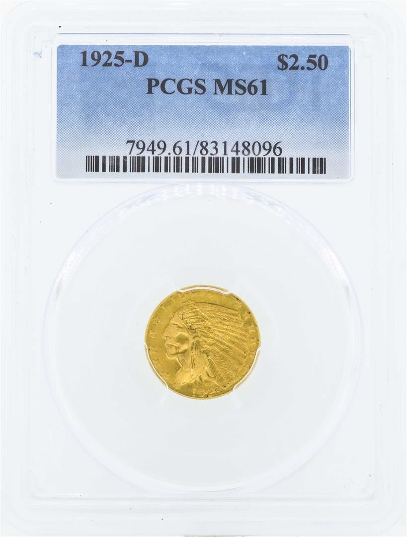 One 1925-D $2 1/2 Indian Head Quarter Eagle Gold Coin PCGS MS62. PCGS Graded.