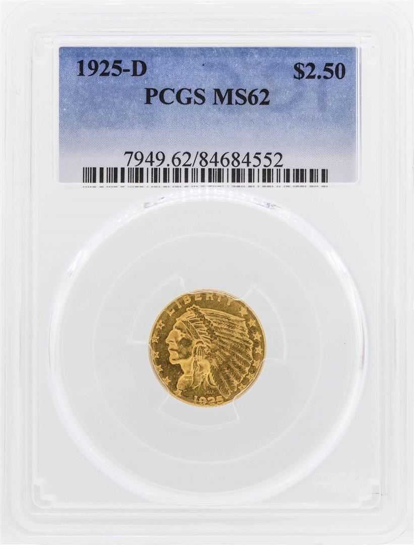 One 1925-D $2 1/2 Indian Head Quarter Eagle Gold Coin PCGS MS62. PCGS Graded.