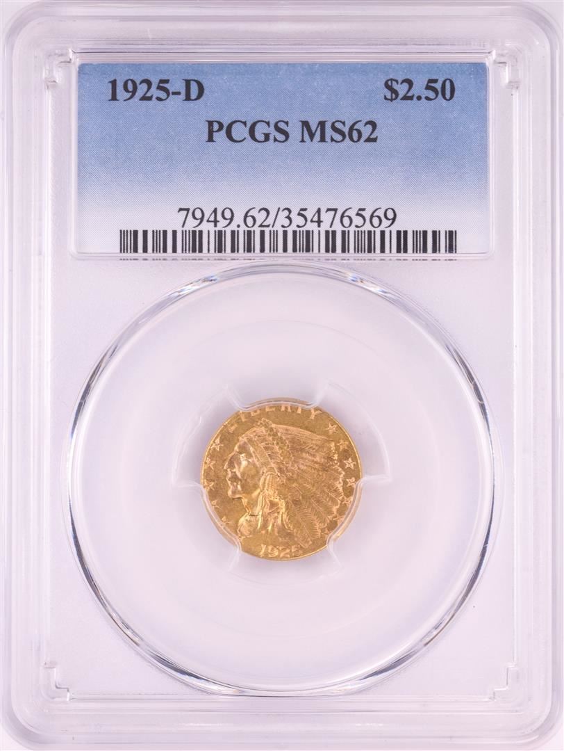 One 1925-D $2 1/2 Indian Head Quarter Eagle Gold Coin PCGS MS62. PCGS Graded.