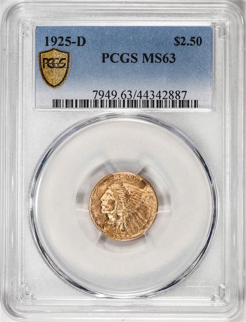 One 1925-D $2 1/2 Indian Head Quarter Eagle Gold Coin PCGS MS63. PCGS Graded.
