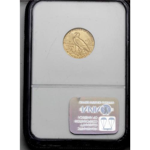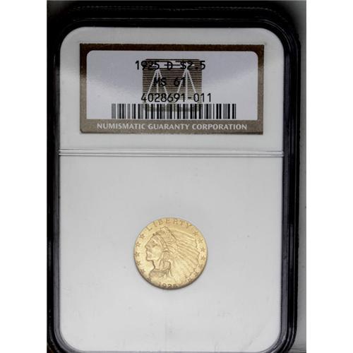 <B>1925-D<$2 1/2> MS61 NGC.</B></I> The first Indian quarter eagle issue struck since 1915 (in Philadelphia), and the first D-mint issue struck since the 1914-D quarter eagle. A few light abrasions on the focal points of each side account for the grade of this honey-gold example.