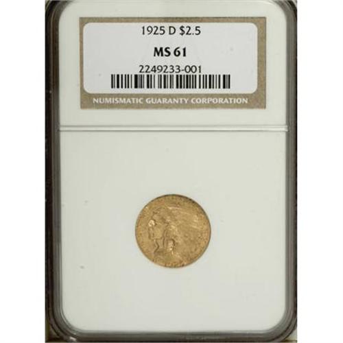 <B>1925-D $2 1/2 MS61 NGC.</B></I> NGC Census: (1953/10678). PCGS Population (1070/7308). Mintage: 578,000. Numismedia Wsl. Price for NGC/PCGS coin in MS61: $295. (#7949)<BR><BR><B>Coin Engraver:</B> Bela Lyon Pratt<BR><BR><b>Shipping:</b> Coins & Currency (<a target="_blank" href="http://www.heritageauctions.com/common/shipping.php">view shipping information</a>)