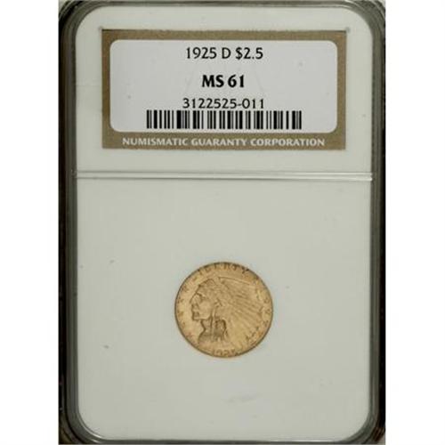 <B>1925-D $2 1/2 MS61 NGC.</B></I> NGC Census: (2027/11040). PCGS Population (1078/7563). Mintage: 578,000. Numismedia Wsl. Price for NGC/PCGS coin in MS61: $315. (#7949)<BR><BR><B>Coin Engraver:</B> Bela Lyon Pratt<BR><BR><b>Shipping:</b> Coins & Currency (<a target="_blank" href="http://www.heritageauctions.com/common/shipping.php">view shipping information</a>)