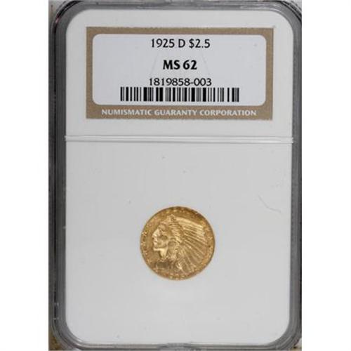 <B>1925-D $2 1/2 MS62 NGC.</B></I> NGC Census: (4362/6214). PCGS Population (2667/4463). Mintage: 578,000. Numismedia Wsl. Price for NGC/PCGS coin in MS62: $455. (#7949)<BR><BR><b>Shipping:</b> Coins & Currency (<a target="_blank" href="http://www.heritageauctions.com/common/shipping.php">view shipping information</a>)