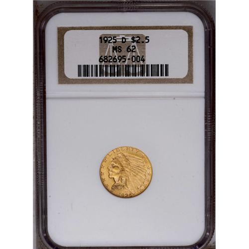<B>1925-D<$2 1/2> MS62 NGC.</B></I> Well struck with peach-gold and green-gold surfaces that display pleasing luster and a minimal number of tiny surface blemishes for the grade.