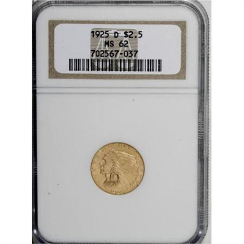 <B>1925-D $2 1/2 MS62 NGC.</B></I> NGC Census: (4373/6275). PCGS Population (2694/4568). Mintage: 578,000. Numismedia Wsl. Price for NGC/PCGS coin in MS62: $445. (#7949)<BR><BR><B>Coin Engraver:</B> Bela Lyon Pratt<BR><BR><b>Shipping:</b> Coins & Currency (<a target="_blank" href="http://www.heritageauctions.com/common/shipping.php">view shipping information</a>\)