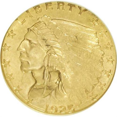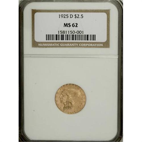 <B>1925-D $2 1/2 MS62 NGC.</B></I> NGC Census: (4408/6322). PCGS Population (2736/4646). Mintage: 578,000. Numismedia Wsl. Price for NGC/PCGS coin in MS62: $485. (#7949)<BR><BR><B>Coin Engraver:</B> Bela Lyon Pratt<BR><BR><b>Shipping:</b> Coins & Currency (<a target="_blank" href="http://www.heritageauctions.com/common/shipping.php">view shipping information</a>)