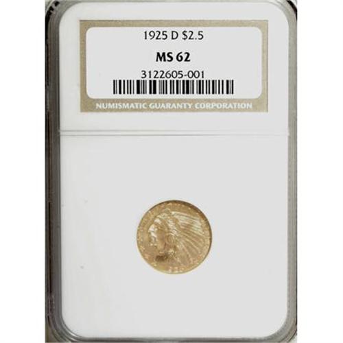 <B>1925-D $2 1/2 MS62 NGC.</B></I> NGC Census: (4565/6603). PCGS Population (2772/4815). Mintage: 578,000. Numismedia Wsl. Price for NGC/PCGS coin in MS62: $455. (#7949)<BR><BR><B>Coin Engraver:</B> Bela Lyon Pratt<BR><BR><b>Shipping:</b> Coins & Currency (<a target="_blank" href="http://www.heritageauctions.com/common/shipping.php">view shipping information</a>)