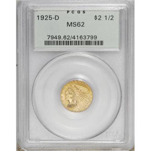 <B>1925-D $2 1/2 MS62 PCGS.</B></I> PCGS Population (2765/4795). NGC Census: (4550/6520). Mintage: 578,000. Numismedia Wsl. Price for NGC/PCGS coin in MS62: $485. (#7949)<BR><BR><B>Coin Engraver:</B> Bela Lyon Pratt<BR><BR><b>Shipping:</b> Coins & Currency (<a target="_blank" href="http://www.heritageauctions.com/common/shipping.php">view shipping information</a>)