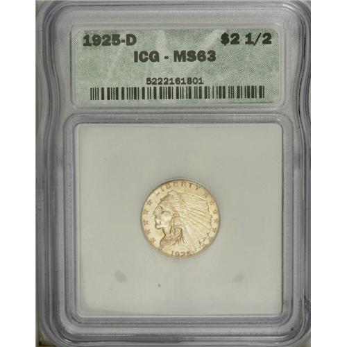 <B>1925-D $2 1/2 MS63 ICG.</B></I> The radiant straw-gold surfaces of the obverse take on a green-gold tinge on the reverse. Aside from the lowest pendant, which displays the usual softness, the strike is solid.<BR><BR><b>Shipping:</b> Coin/Currency (<a target="_blank" href="http://www.heritageauctions.com/common/shipping.php">view shipping information</a>)