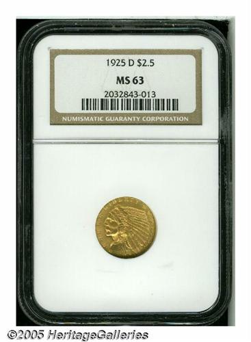 <B>1925-D<$2 1/2> MS63 NGC.</B></I> Sharply struck with soft, frosty luster and excellent eye appeal for the grade. Lovely rose-gold color.<BR><I>From the Dr. Kurt Peters Collection.</B></I> From the Dr. Kurt Peters Collection.