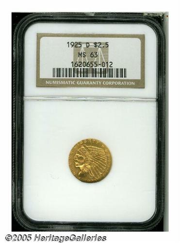 <B>1925-D<$2 1/2> MS63 NGC.</B></I> The pleasing red-gold surfaces are lustrous and well struck. Lacking any noticeable marks or blemishes, this coin appears to be a conservatively graded example.