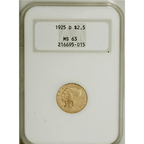 <B>1925-D $2 1/2 MS63 NGC.</B></I> This moderately flashy straw-gold type coin shows some blending of detail on the lower headdress feathers, but the surfaces are attractively unmarked. Housed in an older generation NGC holder.<BR><BR><b>Shipping:</b> Coins & Currency (<a target="_blank" href="http://www.heritageauctions.com/common/shipping.php">view shipping information</a>)