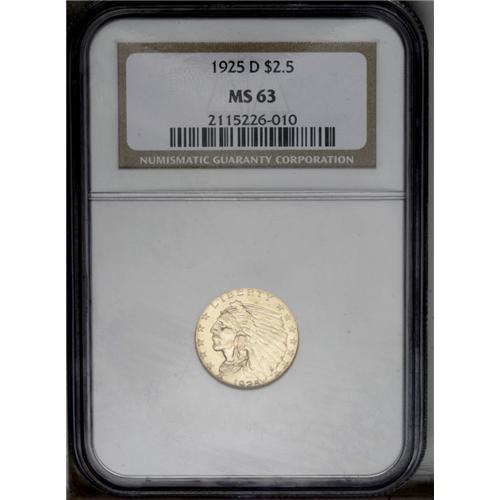 <B>1925-D $2 1/2 MS63 NGC.</B></I> Well struck with bright, satiny surfaces that are minimally marked, for the assigned grade level. This is the highest mintage issue of the Denver Mint for this popular and eminently collectible series.