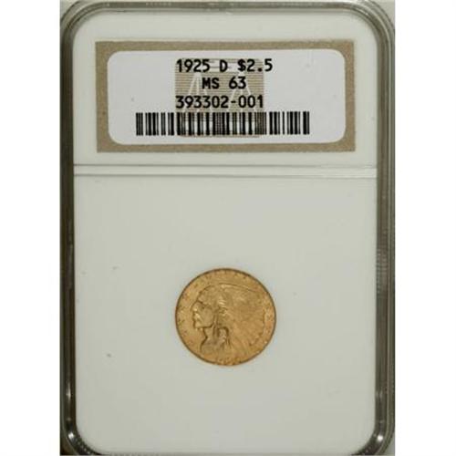 <B>1925-D $2 1/2 MS63 NGC.</B></I> NGC Census: (3292/3187). PCGS Population (2428/2317). Mintage: 578,000. Numismedia Wsl. Price for NGC/PCGS coin in MS63: $825. (#7949)<BR><BR><B>Coin Engraver:</B> Bela Lyon Pratt<BR><BR><b>Shipping:</b> Coins & Currency (<a target="_blank" href="http://www.heritageauctions.com/common/shipping.php">view shipping information</a>)