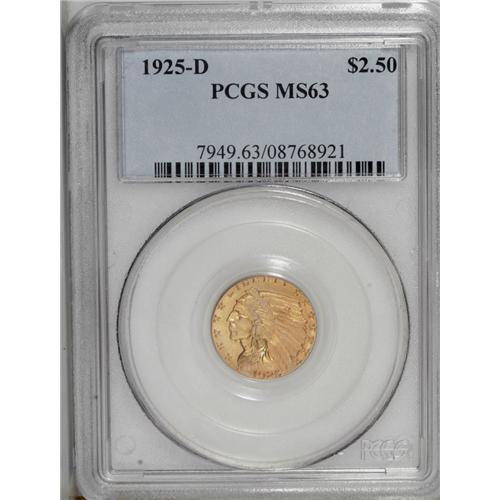<B>1925-D<$2 1/2> MS63 PCGS.</B></I> Both sides are covered with deep reddish-orange coloration. There are a couple of grade-limiting field marks, the most prominent being a vertical mark (planchet flaw?) to the right of the G in GOD on the reverse.