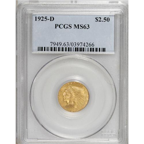 <B>1925-D $2 1/2 MS63 PCGS.</B></I> This charming green-gold piece has satin luster and a well struck eagle. Marks are minimal, particularly on the reverse. Except for a few double eagle issues, the only Denver Mint gold production from the 1920s.<BR><BR><b>Shipping:</b> Coins & Currency (<a target="_blank" href="http://www.heritageauctions.com/common/shipping.php">view shipping information</a>)