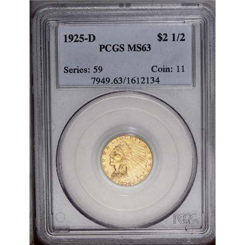 <B>1925-D $2 1/2 MS63 PCGS.</B></I> Well struck with effulgent luster and unusually deep coloration over both sides. The sparkling surfaces reveal amazingly few marks, for the assigned grade level.