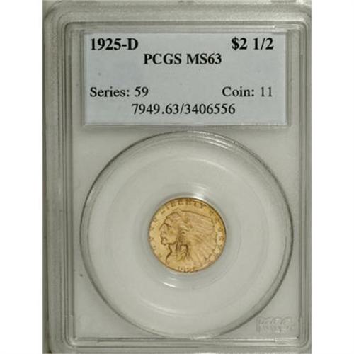 <B>1925-D $2 1/2 MS63 PCGS.</B></I> PCGS Population (2385/2183). NGC Census: (3218/3057). Mintage: 578,000. Numismedia Wsl. Price for NGC/PCGS coin in MS63: $740. (#7949)<BR><BR><B>Coin Engraver:</B> Bela Lyon Pratt<BR><BR><b>Shipping:</b> Coins & Currency (<a target="_blank" href="http://www.heritageauctions.com/common/shipping.php">view shipping information</a>\)