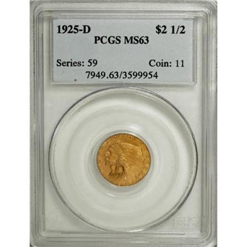 <B>1925-D $2 1/2 MS63 PCGS.</B></I> PCGS Population (2447/2355). NGC Census: (3311/3198). Mintage: 578,000. Numismedia Wsl. Price for NGC/PCGS coin in MS63: $825. (#7949)<BR><BR><B>Coin Engraver:</B> Bela Lyon Pratt<BR><BR><b>Shipping:</b> Coins & Currency (<a target="_blank" href="http://www.heritageauctions.com/common/shipping.php">view shipping information</a>)
