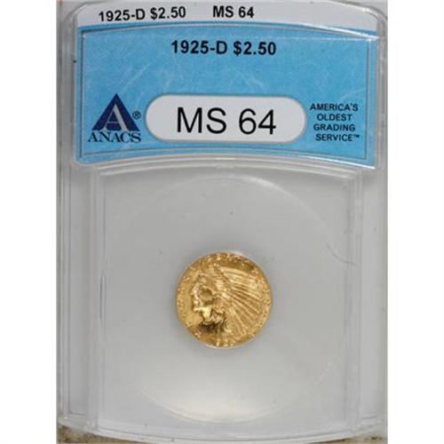 <B>1925-D $2 1/2 MS64 ANACS.</B></I> NGC Census: (2482/575). PCGS Population (1771/412). Mintage: 578,000. Numismedia Wsl. Price for NGC/PCGS coin in MS64: $1,160. (#7949)<BR><BR><B>Coin Engraver:</B> Bela Lyon Pratt<BR><BR><b>Shipping:</b> Coins & Currency (<a target="_blank" href="http://www.heritageauctions.com/common/shipping.php">view shipping information</a>\)