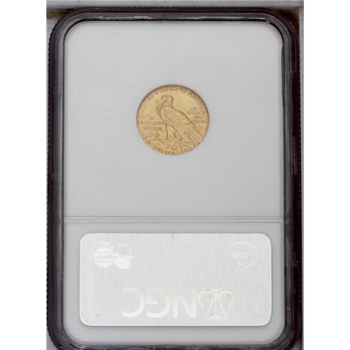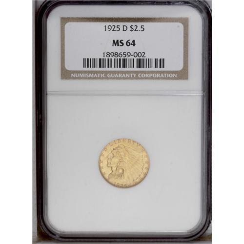 <B>1925-D<$2 1/2> MS64 NGC.</B></I> Well struck with very attractive peach and green-gold coloration. A few tiny field marks on the obverse seem trivial for the assigned grade level. Several faint diagonal die lines (as struck) are noted in the lower obverse field area below and to the left of the Indian's chin.