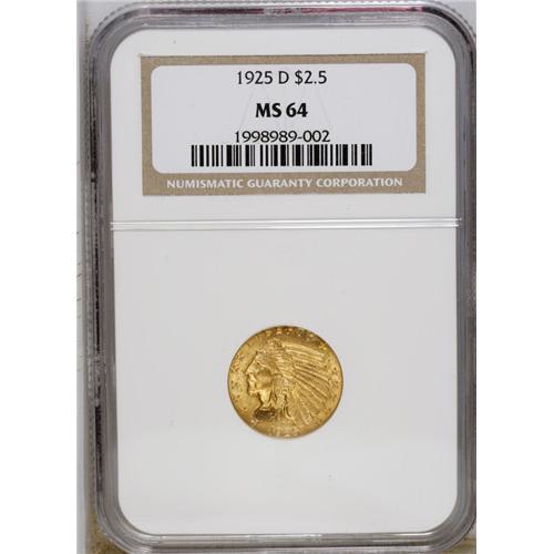 <B>1925-D $2 1/2 MS64 NGC.</B></I> Lustrous brass-gold surfaces are minimally abraded. A nice strike brings out the design details.<BR><BR><b>Shipping:</b> Coin/Currency (<a target="_blank" href="http://www.heritageauctions.com/common/shipping.php">view shipping information</a>)