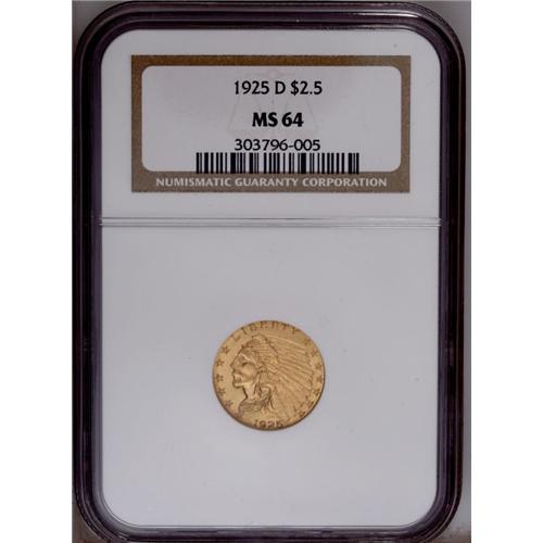 <B>1925-D<$2 1/2> MS64 NGC.</B></I> Peach-gold surfaces display soft luster and sharply struck design elements. A few minute contact marks are not worthy of individual mention.